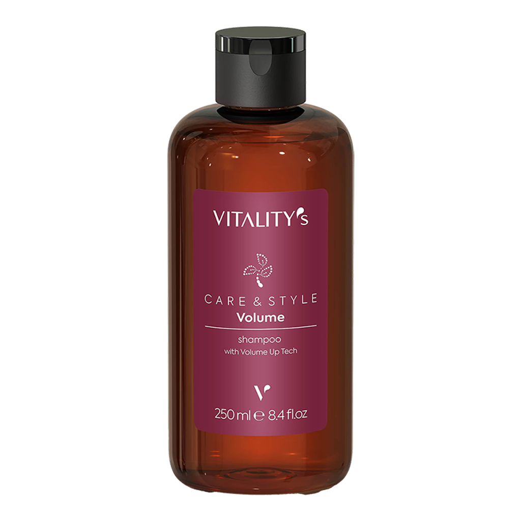 Vitality's Care & Style Volume Shampoo gently and thoroughly cleanses the scalp and hair. It has excellent washing power, eliminates impurities and leaves the hair clean. The soft and compact foam gives a pleasant sensation of lightness and softness to the touch.
